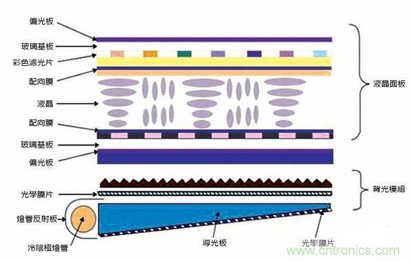 我们先来看看历史已久的LCD显示技术,LCD显示屏结构非常复杂,LCD 的构造是在两片平行的玻璃基板当中放置液晶盒,下基板玻璃上设置TFT(薄膜晶体管),上基板玻璃上设置彩色滤光片,通过TFT上的信号与电压改变来控制液晶分子的转动方向,从而达到控制每个像素点偏振光出射与否而达到显示目的。