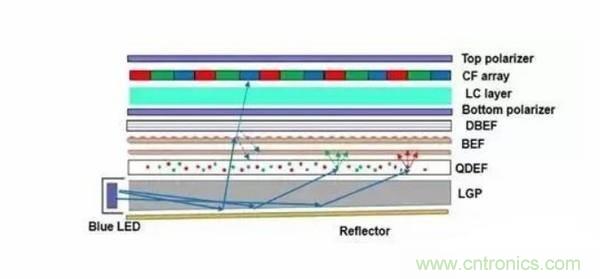 与此同时,QDEF层连摆放位置很计较,为了让光在层层光学膜中旅行时,重复反射通过QDEF的次数增多,所以QDEF还得放在离光源最近的地方,一但顺序往上移,红绿光的转换不足,就会造成偏蓝的现象。