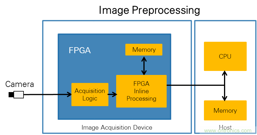 图2.在嵌入式FPGA处理架构中,您可以将相机接口直接连接到FPGA的引脚,以便像素可直接从相机发送到FPGA。