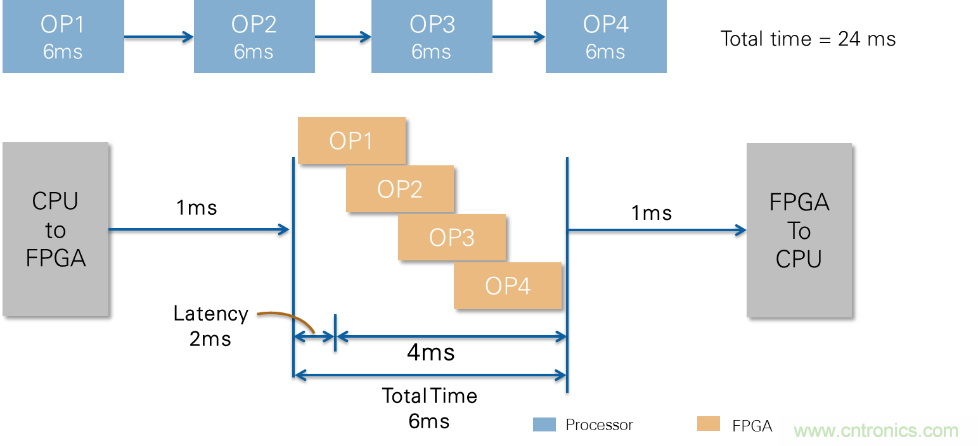 CPU按顺序执行操作,因此第一个操作必须在整个图像上运行结束后,第二个操作才能启动。在本例中,假设算法中的每个步骤在CPU上运行需要6ms;因此,总处理时间是24毫秒。现在考虑在FPGA上运行相同的算法。由于FPGA本质上是大规模并行的,所以该算法中的四个操作可以同时对图像中的不同像素上操作。这意味着接收第一个处理的像素仅需2ms的时间,处理整个图像需要4ms的时间,因而总处理时间为6ms。这比CPU的执行速度快得多。即使使用FPGA协处理架构并将图像传输到CPU,整个处理时间(包括传输时间)也比单独使用CPU要短得多。