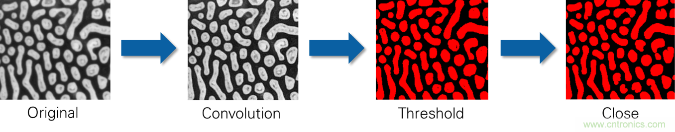 现在考虑一个真实的例子,比如粒子计数所需的图像。首先需要应用卷积滤镜来锐化图像。接下来,通过阈值运行图像以生成二进制图像。这不仅可以通过将其从8位单色转换为二进制来减少图像中的数据量,还可以为二进制形态学应用准备图像。最后一步是使用形态学来应用关闭功能。这会去除二进制粒子中的任何孔。