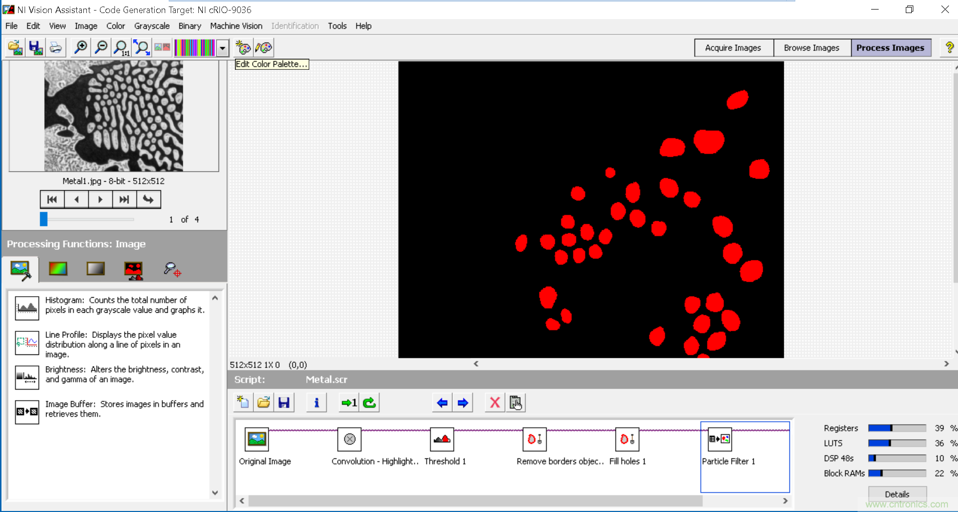 为了实现生产率的最大化,不论使用哪种处理平台,都需要立即获得关于算法的反馈和基准测试信息。当使用迭代探索性方法时,实时查看算法结果将会节省大量时间。什么是正确的阈值?用二进制形态滤波器剔除的颗粒多大或多???哪种图像预处理算法和算法参数可以最好地清理图像?这些都是开发视觉算法时的常见问题,而关键在于是否能够更改并快速查看结果。然而,传统的FPGA开发方法可能会减缓创新,因为算法的每个设计变化之间需要编译时间??朔庖坏愕囊桓龇椒ㄊ鞘褂靡桓鏊惴⒐ぞ?,可让您在同一个环境进行CPU和FPGA的开发工作,而不会在FPGA编译时陷入困境。NI Vision Assistant是一种算法工程工具,用于开发部署到CPU或FPGA上的算法,以帮助您简化视觉系统设计。您还可以使用Vision Assistant在目标硬件上编译和运行之前测试算法,同时轻松访问吞吐量和资源利用率信息。