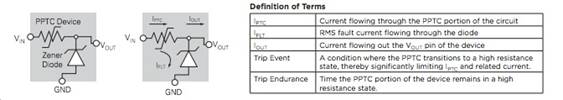 PolyZen 器件集成了精密齐纳二极管和 PolySwitch PPTC(聚合物正温度系数)器件,并通过热粘合方式实现。本质上,PolyZen 器件提供了热?;て肽啥?,该二极管在单个封装中提供多种优势。PolyZen 系列产品包括两个器件系列,部件号以“LS”和/或“CE”结尾。每个系列都提供不同齐纳电压 (Vz)、PPTC 保持电流 (IHOLD) 和输入电压额定值 (Vintmax – 称为 VIN) 选项的组合。这一系列选项为设计人员提供了多种器件,可用于需要过流/过压保护的各种实际应用。PolyZen 产品原理图和相关术语定义如图 1 所示。