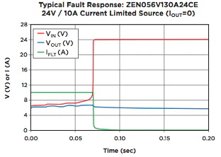 图 3 显示了特定 PolyZen 器件的典型故障响应。在此示例中,PolyZen 器件(部件号 ZEN056V130A  24CE)集成了 5.6V 齐纳二极管 (Vz)、1.3A IHOLD PPTC 和 24V VIN(指定为 Vintmax 但缩写为 VIN)。VIN接24V、10A限流电源,IOUT=0。当故障电流在 24V 过压 (VIN) 故障下流经系统时,PolyZen 器件的精密齐纳二极管将输出电压钳位在齐纳钳位电压 Vz (~5.6V),以?;じ涸氐缏?。同时,PPTC 器件跳闸,切断电流,以帮助保护齐纳二极管以及整个电路。