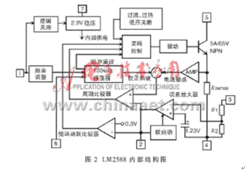 LM2588采用7脚TO-220封装,主要包括100kHz振荡器、2.9V稳压电路、误差放大器、5A/65V的NPN开关管以及过流、过热、低电压锁定,还包括软启动、逻辑关断、逻辑控制等,内部结构如图2所示。