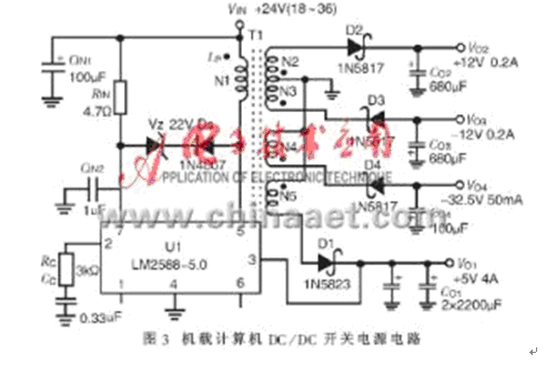 U1为控制器LM2588-5.0。脉冲变压器T1共有五个绕组:N1为初级绕组,N2、N3、N4、N5为次级绕组,分别对应输出+12V@0.2A、-12V@0.2A、-32.5V@0.05A以及+5V@4A,且N2、N3圈数相同。