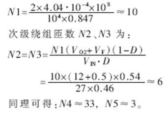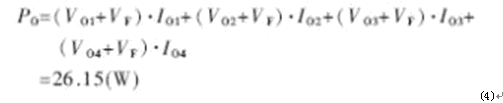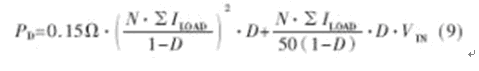 损耗功率PD主要取决于VI、多路输出最大负载电流之和ΣILOAD以及主功率线圈比N等,其近似计算公式如下: