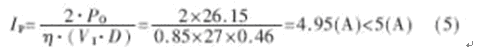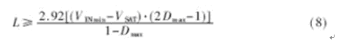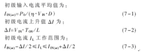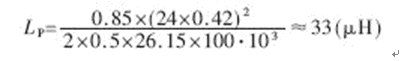 设PWM控制最大占空比Dmax=42%,如果初级绕组的电感量设计得大,则流过功率开关管和输出滤波电容的电流峰值小,但由于电流上升斜率小,电路抗干扰能力差且功率开关管开通电流大;电感量小时,电流脉动大,冲击电流大。因此设计电感电流工作在连续工作状态,轻负载时取额定功率的一半,由(2)式可知: