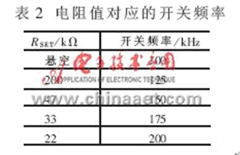 开关频率可以通过外接电阻RSET在100kHz~200kHz之间调整,这个特点可以让使用者根据工作频率优化磁存储器以及电容器的尺寸、型号等。表2为不同的电阻值对应的常用开关频率。
