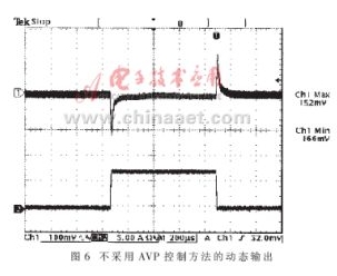 本文通过检测输出电感电阻的阻值,对其进行适当的处理,有效地实现AVP控制(如图5所示),避免了在电感与输出端增加电阻所引起的效率下降问题。图5(b)和图6为采用AVP控制方法和不采用AVP控制方法两种情况下的实测动态波形。输出电流由空载到半载(0→7.5A)时测得输出电压峰-峰值为97mV,而不采用AVP控制方法时输出电压峰-峰值为318mV。而且图5(b)的动态恢复时间明显比图6的恢复时间短??杉?,采取AVP控制有着良好的动态响应,进而可减小输出电容及降低成本。