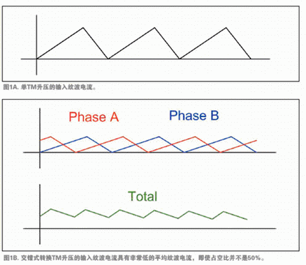 为了生产的更薄、高效而廉价的电源,近来开发了UCC28060,在单一设备中采用两个交错式转换通道TM PFC的集成电路。UCC28060充分发挥了TM的全部优势,并利用交错式转换的优势来弥补TM的缺点。例如,如图1A与1B所示,交错式转换降低了输入纹波电流,所以可以使用小得多的EMI滤波器。交错式转换还降低了输出波纹,可使用较小的输出电容,并能延长电容寿命。交错式转换还可将一个大电感分成两个较小的电感,提高了功率级别并实现了超薄的封装。