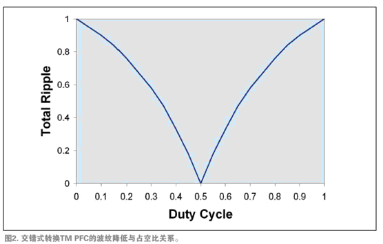 如果交错式转换电源转换器以50%的占空比工作,第一相的输入波纹完全抑制了第二相的输入波纹,从而产生无开关成分的输入电流,且不会产生EMI。在占空比偏离50%时,抑制作用降低,残余波纹增大(参见图2)。然而,波纹抑制多数的优点还是实现了。
