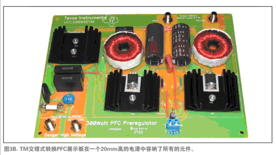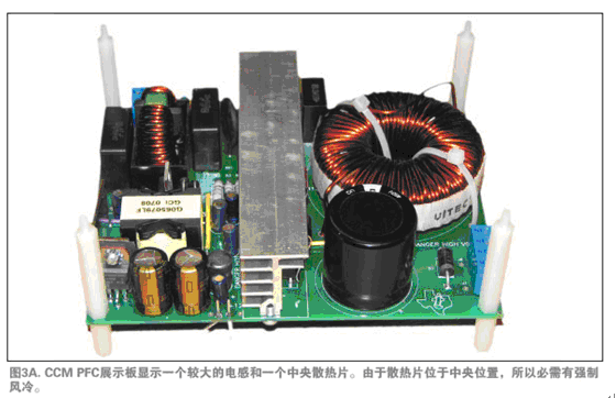图3A与3B显示了两个原型电源。图3A是一个有正向转换器进行输出稳压的单相CCM PFC及一个EMI滤波器。在此电源中,电感、大型滤波电容及散热片体积均较大,位于中央位置,使电源体积略为庞大。图3B是一个两相交错式转换TM PFC。交错式转换电源非常薄,因为电感体积缩小了,输出滤波器电容尺寸及布局均为散热而考虑。如果布局采用同样的规则,交错式转换TM PFC也可以缩小体积。