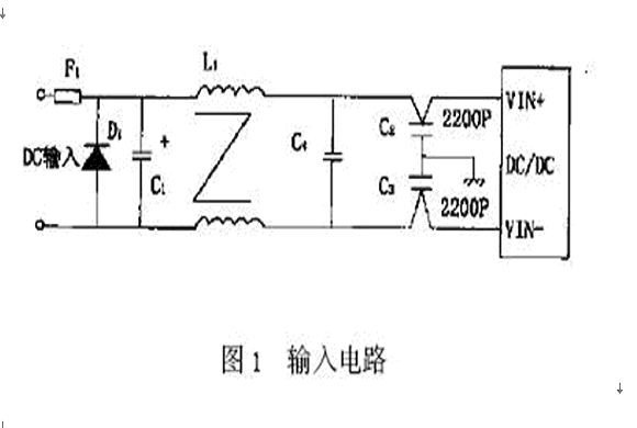 DC/DC转换模块一般先把直流转换为高频交流,再把高频交流转换为稳定直流,容易形成各种噪声,在输入端表现为传导噪声和辐射噪声。输入滤波电路主要作用是减小输入噪声和阻止二次电源向输入电源反馈的噪声。输入滤波器一般采用EMI滤波器,主要由共态扼流圈L1、跨接线路电容C1、C4以及线路高通滤波电容C2、C3组成。