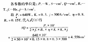 由厂家手册知,EE55磁芯的S=3.54cm2,Q=3.1042cm2,则SQ=10.9cm4,EE55磁芯的SQ值大于计算值,选定该磁芯。