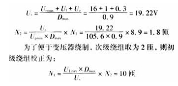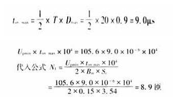 计算原副边绕组匝数:按输入电压最低及输出满载的情况(此时占空比最大)来计算原副边绕组匝数,已知Umin=176V经整流滤波后直流输入电压Udmin=1.2×176=211.2V。
