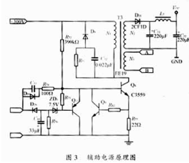 辅助电源采用RCC变换器(RingingChokeConverter),见图3。其输入电压为交流220V整流滤波电压,输出直流电压为12.5V,输出直流电流为0.5A。电路中Q8和变压器初级绕组线圈N1与反馈绕组线圈N3构成自激振荡。R72为启动电阻。Q9、R77构成辅助电源初级过流?;ぁ20、C81、ZD1、Q11、R75、R76构成电压检测与稳压电路,控制Q8的基极电流的直流分量,从而保持输出电压恒定,变压器采用EE19、LP3材质构成。初级180匝,反馈绕组5.5匝,次级11匝,初级电感量是2.6mH,磁芯中间留有间隙0.4mm。