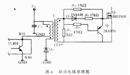 驱动电路如图4所示。TL494输出50kHz的脉冲信号,通过高频脉冲变压器耦合去驱动功率MOS管。次级脉冲电压为正时,MOS管导通,在此期间Q7截止,由其构成的泄放电路不工作。当次级脉冲电压为零时,则Q7导通,快速泄放MOS管栅级电荷,加速MOS管截止。R70是用于抑制驱动脉冲的尖峰,R68、D15、R67可以加速驱动并防止驱动脉冲产生振荡。D17和与它相连的脉冲变压器绕组共同构成去磁电路。