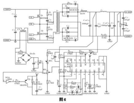 控制电路采用通用脉宽调制器TL494,具有通用性和成本低等优点,见图6。输出电压经R40、RV2、RV1、R41进行分压采样,经R5阻抗匹配后送到TL494脚1。RV1装在电源前面板上用于实现输出电压的调节。R103和C14将输出电感L1前信号采样,经R5送到TL494脚1,用于提高电源稳定度,消除L1对环路稳定性影响。