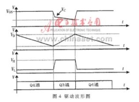 由于加速电容C4的作用,实际工作时,MOSFET的栅-源极输入脉冲的下降沿非常陡,且又由于栅-源极输入电容的作用,使VGS 波形具有一定的斜率,这有利于MOSFET的饱和导通。图4为驱动波形。