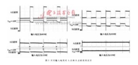 图5为当输出电压为10V、电流为2A时,在不同输入电压状态下,图3中A点和B点的实测波形。由图5可知,当输入电压为13V时,MOSFET关断时间很短,当输入电压为10V时,MOSFET则一直导通。