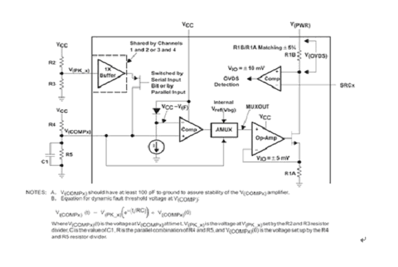当该特定通道处于“关闭”状态时,经过编程的 VPEAK(X) 值被反映在 VCOMP(X) 上。如果一个特定通道被开启,那么过电流检测的参考电压就为动态,并且用内部 VPEAK 设置和VCOMP(X) 终端外部组件值表示。