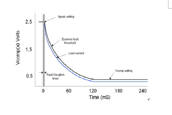 白炽灯的发光照明要求有一个动态故障阈值来对高浪涌电流进行补偿,并防止在开启之初错误地触发过电流条件。一个带有开关的 RC 网络的使用可以设置该动态故障的阈值(参见图1)。通过使用这种方法,可以针对不同的白炽灯泡对短路电流进行优化。在最初的过电流阈值被设置时设置 VPEAK 电压,然后当在 VCOMP 终端上设置的电阻器分压器值为恒定不变的 RC 时间常数时进行衰减。每当栅极从“关闭”状态转到“开启”状态时,便通过一个适当通道的并行或串行输入比特产生这种可变过电流阈值的波形。