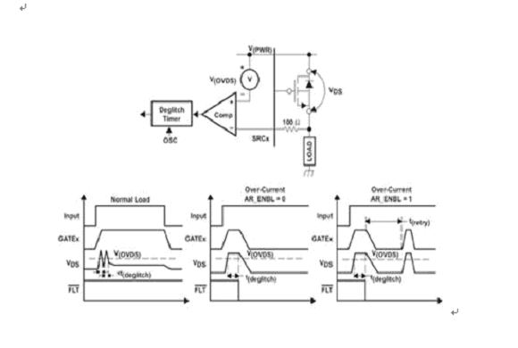 当检测到一个过电流状态时,通过“关闭”器件或激活将以低占空比自动重试和 “开启”FET 的选项设置,就可以对 FET 进行保护。这样就允许系统不断地检查故障是否已经被排除,并且不会破坏 FET。图3显示了这种过电流检测保护的原理图。