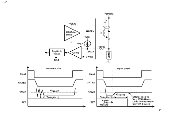 如果检测到一个开路负载或高阻抗,那么小恒定电流将使开路负载检测阈值以上的 SRCx 节点发生偏置,进而检测到故障(见图4)。