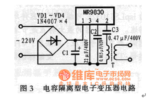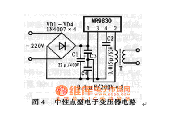 图3和图4是两种不同接法的电子变压器电路,其原理都是将MR9830的2脚输出的高频电压由铁氧体变压器T降压和隔离后输出。其中,图3是将MR9830的2脚输出由C3隔离后得到电源负端形成回路。图4则是利用C3、C4制造一个人为的“中性点”,而让MR9830的2脚输出的高频电压经T的初级绕组到此“中性点”形成回路。经实际测试发现:图3输出的电压