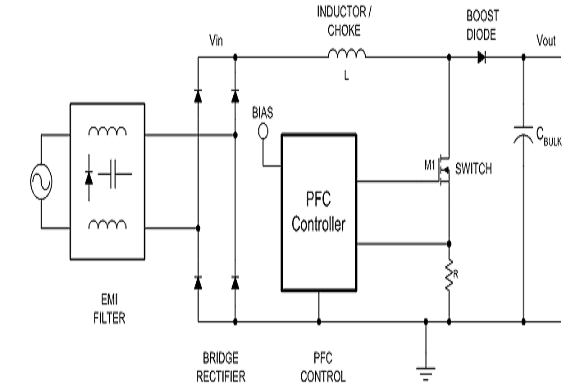 [图中文字:电感/扼流线圈、升压二极管、PFC控制器、功率开关、桥式整流器、PFC控制、EMI滤波器]
