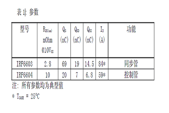 此设计可以高效输出超过100A(>25A/相)的电流而面积只有95mm×31mm(3.8inch X 1.25inch )。每项均使用一个控制管和一个同步管的DirectFET MOSFET。用作控制管和同步管的30V DirectFET的规格见表1。请注意它们高的载流能力省去了器件并联的需要。