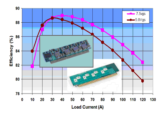 VRM线路板被重新设计,用4Oz厚覆铜,进一步减小PCB走线电阻,改善热性能。图2所示为这款4Oz厚覆铜板的VRM,在500KHz工作频率,12V输入电压,1.7V输出电压,600LFM风冷的条件下的效率曲线。在一个很宽的负载电流范围内,7.5V栅驱动电压表现出更高的效率。此款VRM在最大负载电流120A时,效率达到82%。