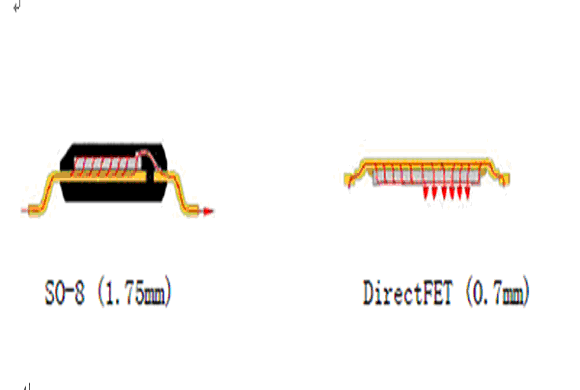 传统的MOSFET使用引线键合来实现硅片和管脚框架之间的电连接,而DirectFET,将接触面的数目和传导路径的长度减到最小从而减小了传导损耗。