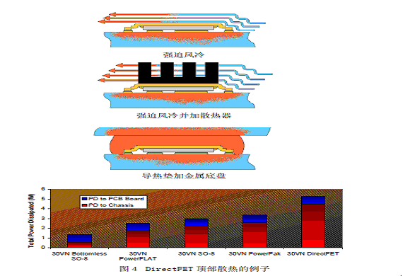 DirectFET封装的顶部金属漏极连接为芯片的结和顶部封装之间提供了一条较低的热阻抗路径使结到壳的热阻只有3°C/W 。这就使得器件的散热方法与以往有很大不同,可以用强迫风冷或导热的填充介质将热传到一个适当接地的散热器上。图4举例说明了这些概念。