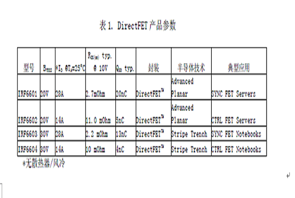 最先使用DirectFET封装的器件是20 V和30V的同步降压变换器芯片组,用做调整管和同步管(表1)。