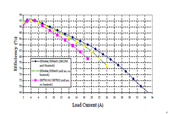 在一个12V输入,1.3V输出,工作频率300kHZ的同步降压变换器中,我们将IRF6603/IRF6604和IRF7822/IRF7811W这两对管子做以比较,它们使用的硅片技术是相同的。负载电流增加时,此变换器电路板的温度不得超过105°C。当电流达到18A时,这是SO8封装在无冷却气流的条件下能够承受的大电流,IRF6603的结温要低50°C。比较DirectFET和SO-8在静止空气无散热器条件下的效率曲线,在18A时前者的效率要高出3%。
