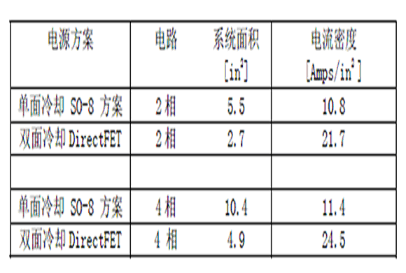 表2. 在30A/相的变换器中用单面散热的SO-8封装MOSFET,比如标准的 SO-8,无底的SO-8和无铅的SO-8和用双面散热的DirectFET的电流密度比较封装节省系统总成本