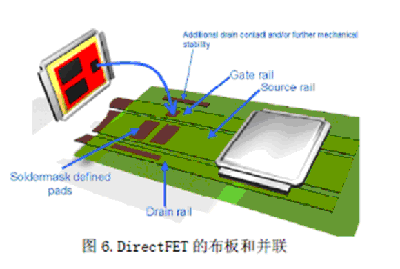 采用单面冷却的SO-8方案,设计者考虑散热问题时有一些可选的方法:当每相的电流值达到上限时,他们可以增加相数,而依目前的技术,超过4相是不现实的。而且增加了成本和所占空间。也可考虑热管,加风扇增大冷却气流,更大尺寸的线路板或更多的覆铜。这些方案都将增加系统成本。DirectFET给设计者一个新的选择,既能够满足电路性能,外形尺寸和预算要求,同时省掉50%或更多上面讨论的用于标准的或其它派生的SO-8封装可选散热方案中的花费。DirectFET MOSFET容易布版和并联,可以简化布局减小PCB板寄生损耗(见图六)