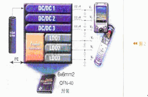 图2是TI公司的一种电源管理IC(TPS65021)的功能结构示意图。它由1节锂离子电池供电,由微处理器通过I2C与器件接口。TPS65021内部有控制功能电路及6个电源(3个DC/DC转换器,3个线性稳压器LDO,输出V1-V6电压)。它可以给手机供电及实现负载管理。