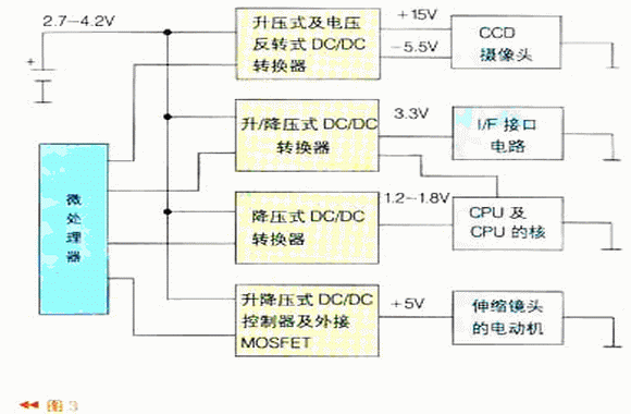 数码相机中有三种电源:系统电源、LCD电源以及白光LED驱动电源(背光照明及闪光灯电源)。系统电源部分由4个DC/DC转换器组成,如图3所示。它分别给CCD摄像头、I/F接口电路、CPU的核及伸缩镜头的电动机供电,通过微处理器可做负载管理,微处理器也可以根据工作状态要求来控制LCD背光亮度及闪光灯驱动电路。