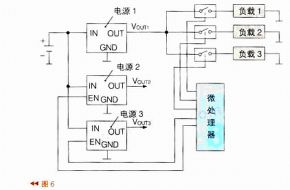 由微处理器及N个负载开关及N个负载组成的负载管理结构框图如图5所示。各个负载开关接在电源与负载之间,其ON/OFF端与微处理器的I/O口连接。在不同的工作状态时,由微处理器给各个负载开关的ON/OFF端输出逻辑电平;输入高电平的负载得电,输入低电平的负载失电。采用这种方案也能实现负载管理,主要用于一个电源带多个负载的产品中。
