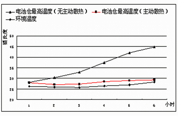 因此户外电源设计中针对电池仓的环境控制非常关键。尤其在高温环境中要有针对性的散热措施,研究表明,传统的自然开孔散热难以满足电池的应用要求。在传统的自然开孔散热条件下,虽然蓄电池自身发热量较小,但随着环境温度的升高,在蓄电池仓中的热累积会逐步的升高电池仓的温度,在太阳照射的条件下情况更为严重。如图6所示,在自然散热条件下(仓内无主动散热措施),电池仓内温度会远高于环境温度。在同样的条件下,采用主动散热技术,电池仓内温度基本接近于环境温度,电池工作条件会得到极大改善。根据此项研究结果,艾默生开发了电池仓独立风道散热技术,保证了电池仓的充分散热,极大的改善了电池工作温度,提高了电池寿命。