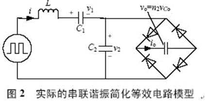 高频升压变压器和高压整流二极管的分布电容对充电电流的工作状态影响较大,是不能被忽略的。变压器的分布电容较为复杂,在高频高压升压变压器中,为减小变压器体积和漏感,通常采用导磁率较高的铁芯,如超微晶合金材料,变压器原边匝数较少;为减少变压器原副边耦合,通常设有屏蔽绕组;从而可以忽略原边分布电容、原、副边分布电容的影响。变压器的激磁电抗较大,其影响也可以忽略。于是实际的串联谐振电容器充电电路可等效于图2 所示电路??梢钥闯觯导实缏繁涑闪艘桓龃⒘痴癯涞绲缏?。