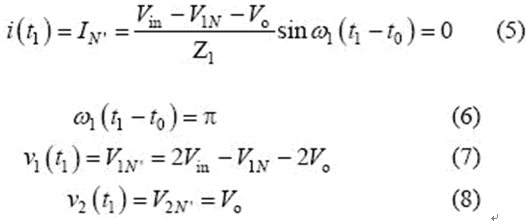 当串联谐振电流为0(即t1 时刻)时,该模式结束,可得到如下表达式: