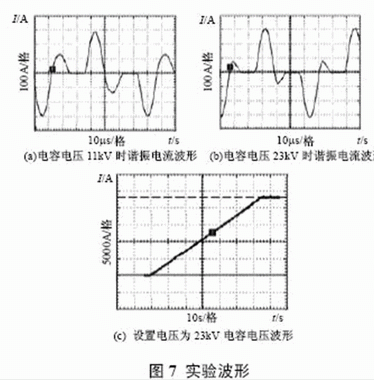 根据上面所设计的谐振参数进行了实验,实验波形如图7 所示??梢钥闯?,为保持充电电流恒定,随着输出电压的升高,开关频率变高,实测充电电压为23kV 时变换器效率为92.7%。实验表明,所设计的谐振参数完全满足设计要求,该装置已用于神光III 能源系统。