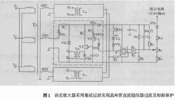 尽管功率场效应VDMOS 和绝缘栅双极型晶体管IGBT等电力半导体元器件层出不穷,且在电力电子技术领域占据重要位置,晶闸管(可控硅) 却因耐高压耐大电流冲击的特性,仍有着稳固的阵地,受到用户的青睐。在摈弃电流采样、放大和执行等多个环节的情况下,将单结晶体管移相触发器中的晶体管误差放大器改为集成运算放大器,就可实现晶闸管直流稳压器的过流及短路?;?简化了电路结构,并提高了整机的稳定可靠性能和AC - DC变换效率。
