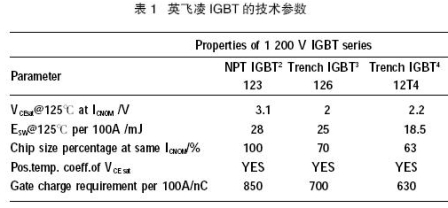 英飞凌的3 个主要IGBT 技术系列的最重要的专用参数如表1 所列,它们都为1 200 V SEMI原TRANS??樗褂?。