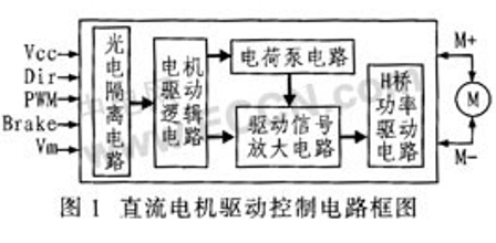 直流电机驱动控制电路分为光电隔离电路、电机驱动逻辑电路、驱动信号放大电路、电荷泵电路、H桥功率驱动电路等四部分,其电路框图如图1所示。