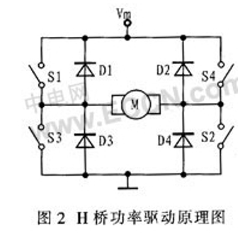 直流电机驱动使用最广泛的就是H型全桥式电路,这种驱动电路方便地实现直流电机的四象限运行,分别对应正转、正转制动、反转、反转制动。H桥功率驱动原理图如图2所示。